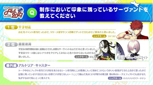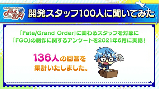 各国のFGOゲーム進捗のほか、各国でのロゴデザインや翻訳について現地スタップのインタビュー映像が公開された。リアルイベントの催しや出し物も各国のこだわりで作製されている。