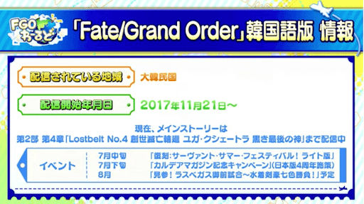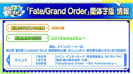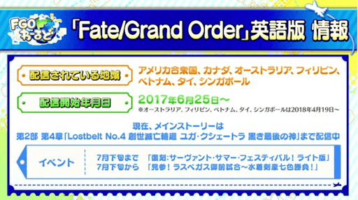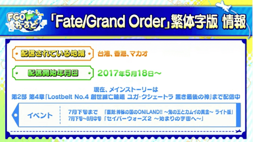 | 放送予定内容 | ・世界のFGO運営を比べるバラエティ ・FGOスタッフトーク ・FGOCM楽曲ライブ |