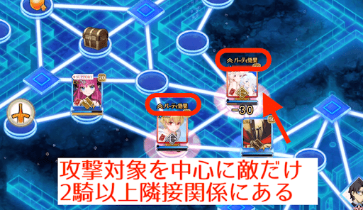 パーティ効果発動の条件は、敵の行動ターンでも味方の行動ターンでも等しく「攻撃対象を中心に隣接している同勢力サーヴァントが存在すること」だ。バトル参加条件とイコールなので、パーティ効果が発生しているサーヴァントはバトルにも参加すると覚えておくと良い。