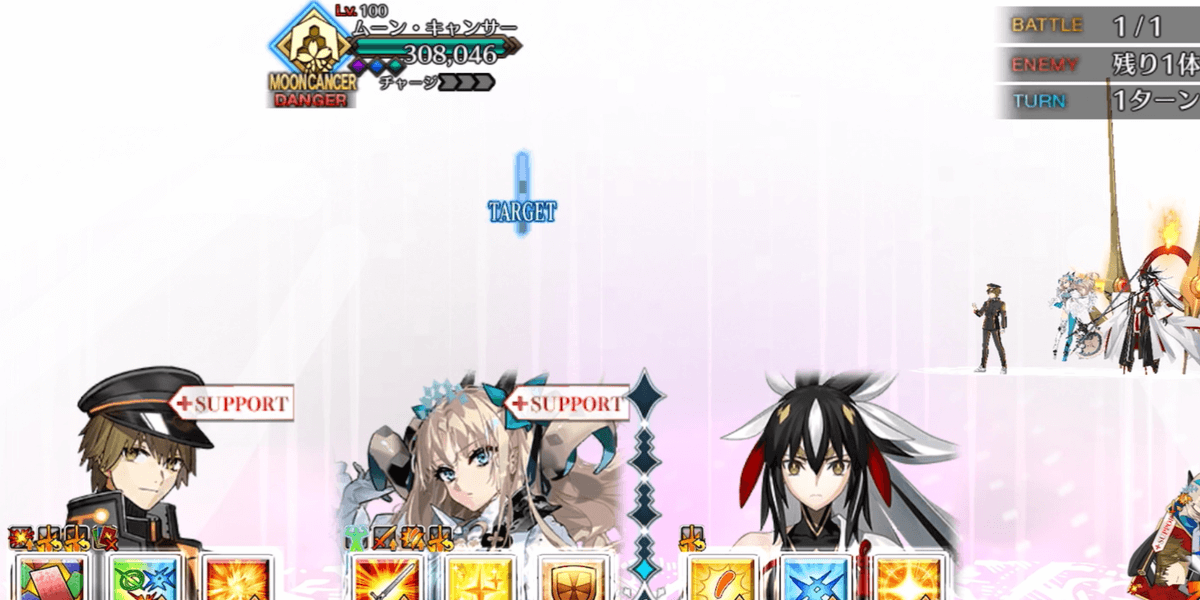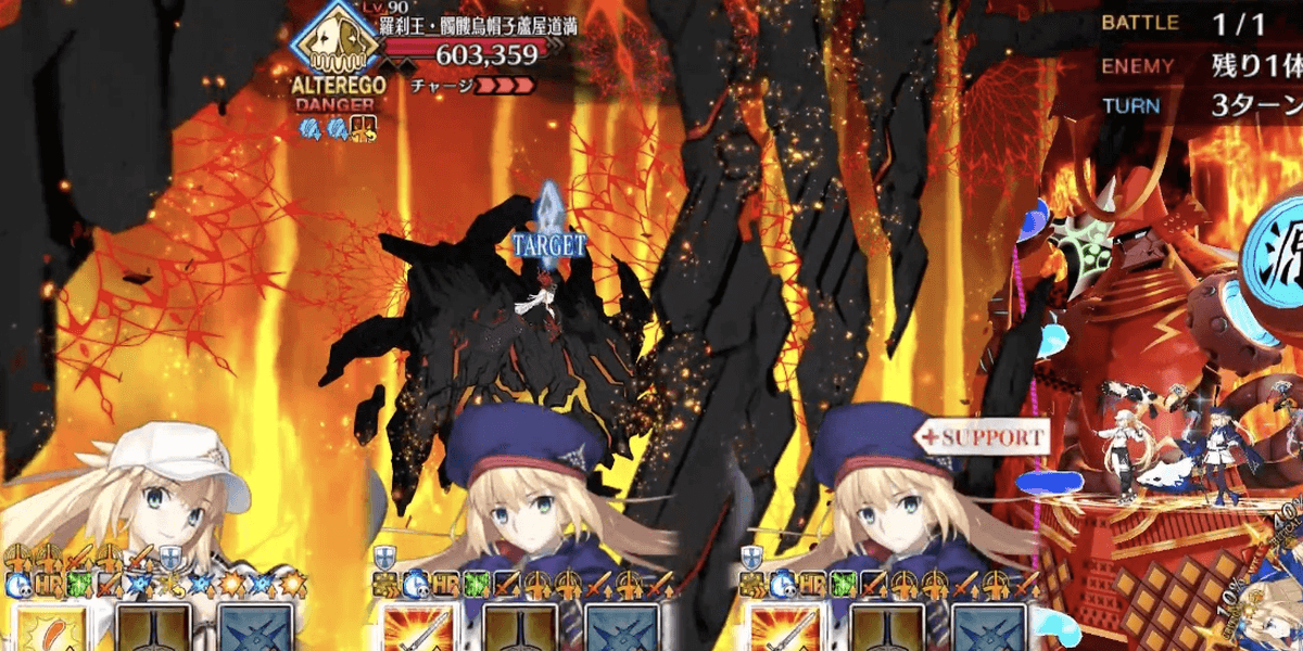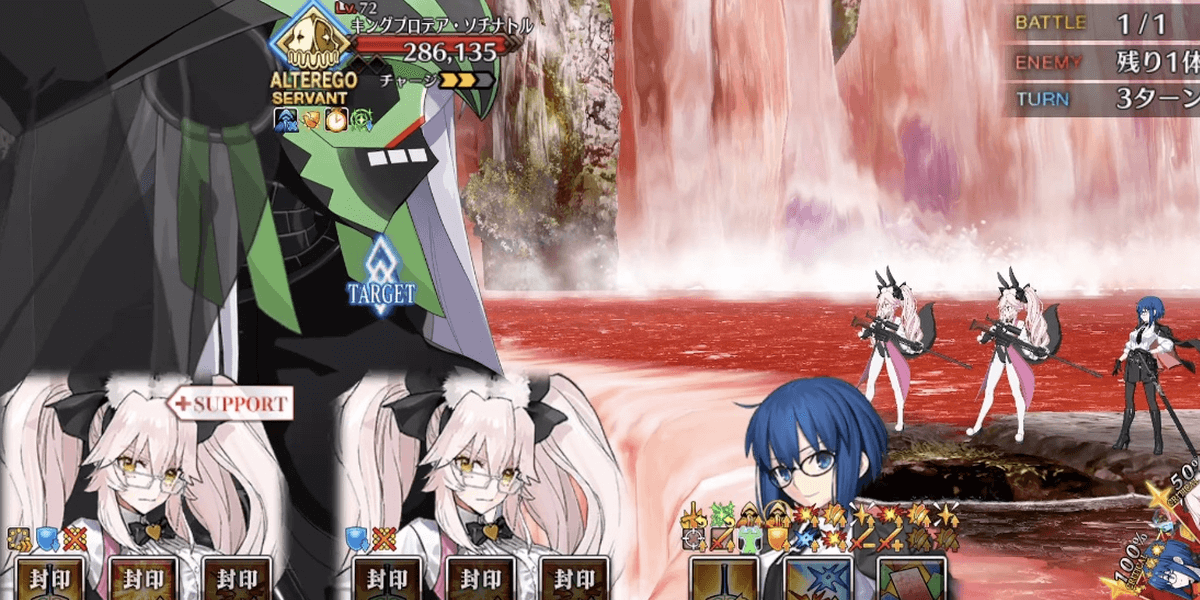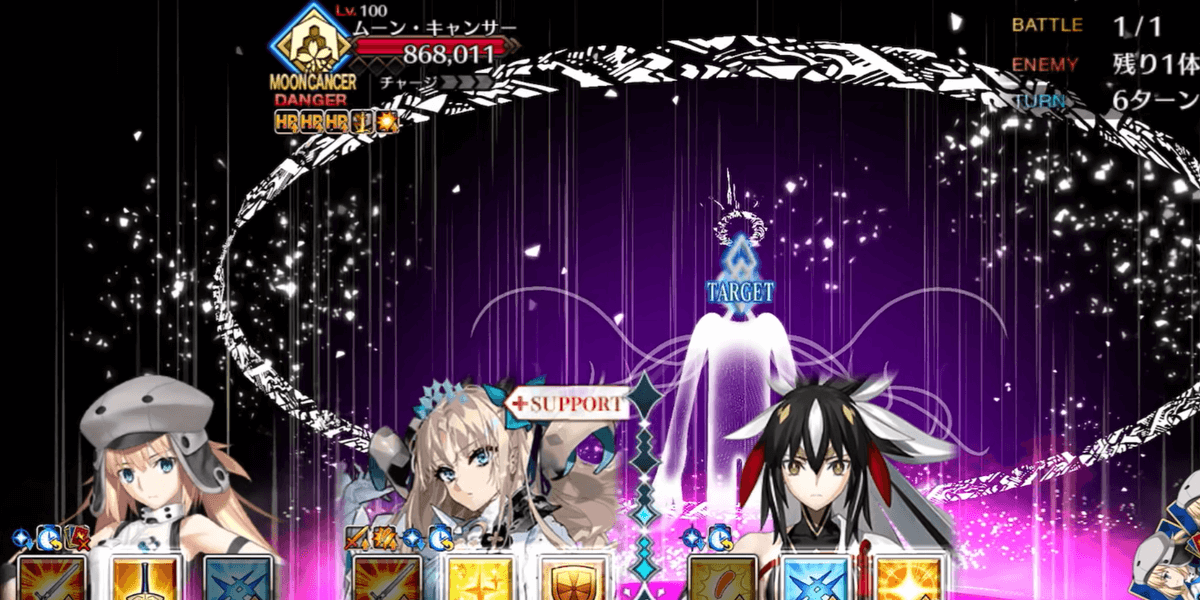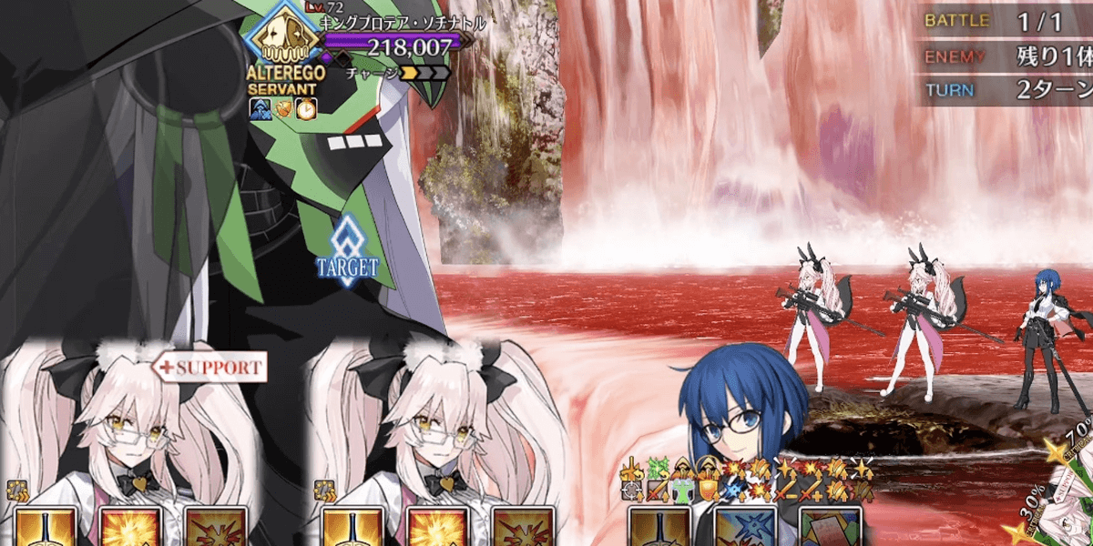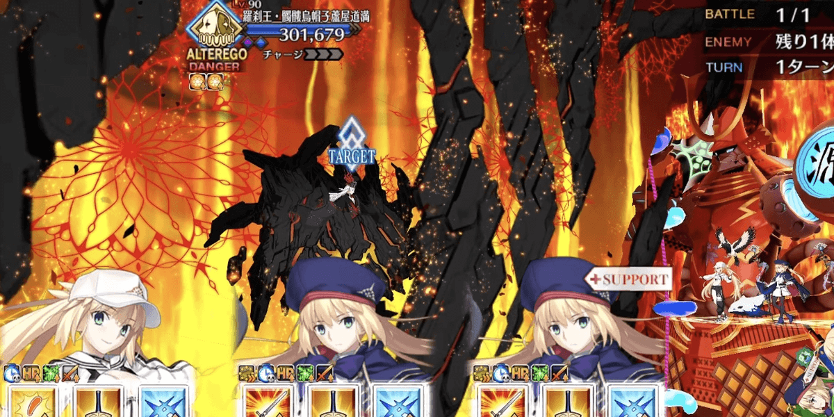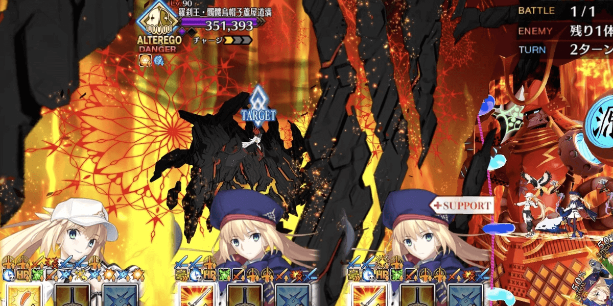 | ギミック | ・敵は特殊耐性(宝具&クリ)持ち ┗ブレイク毎にクリ→宝具が解除 ・最終ゲージでは毎ターンチャージ+1 ・スキルでコマンドカードに「カード燃焼」付与 ┣付与カードで攻撃するとHP減少(500) ┣6つ以上貯まると「呪殺の符」付与 ┗呪殺の符状態で宝具を受けると即死 |