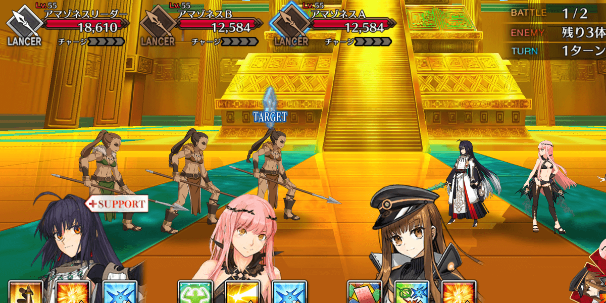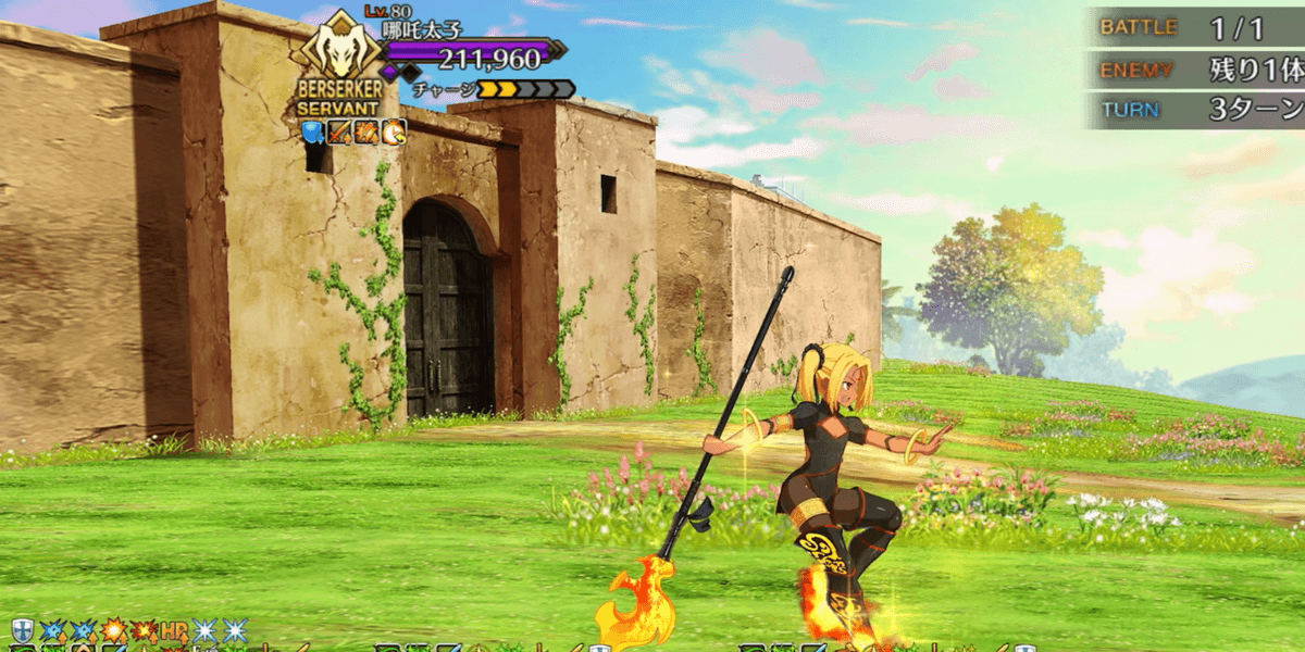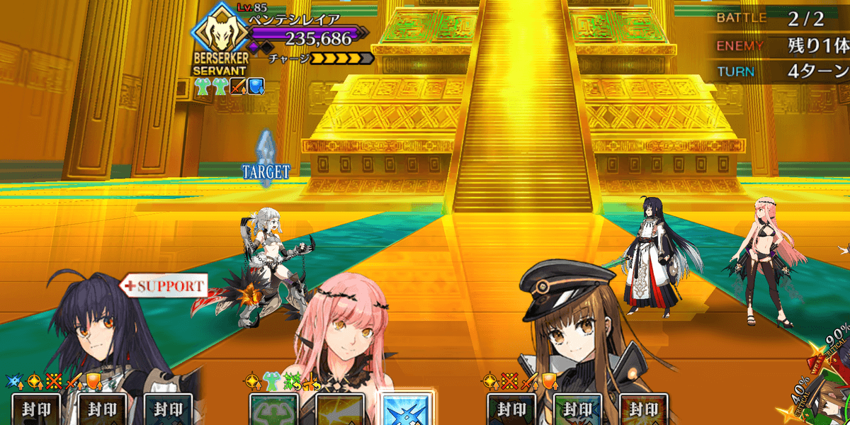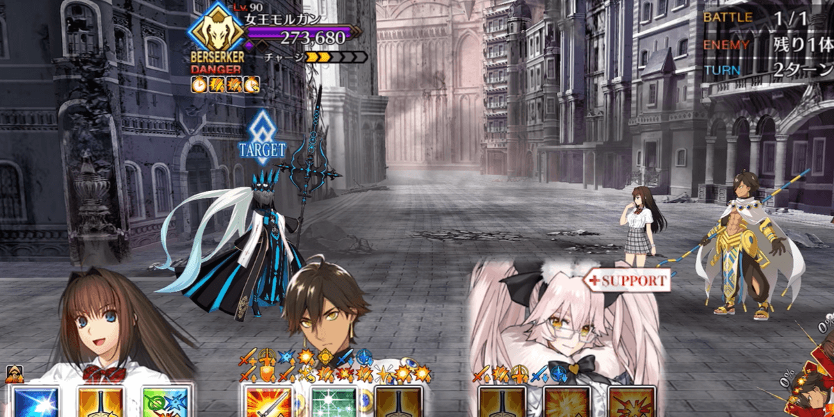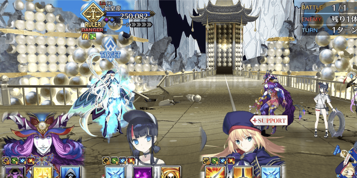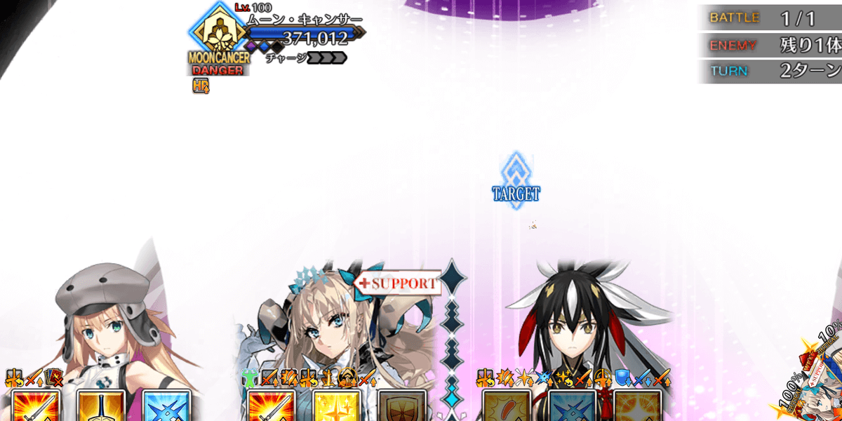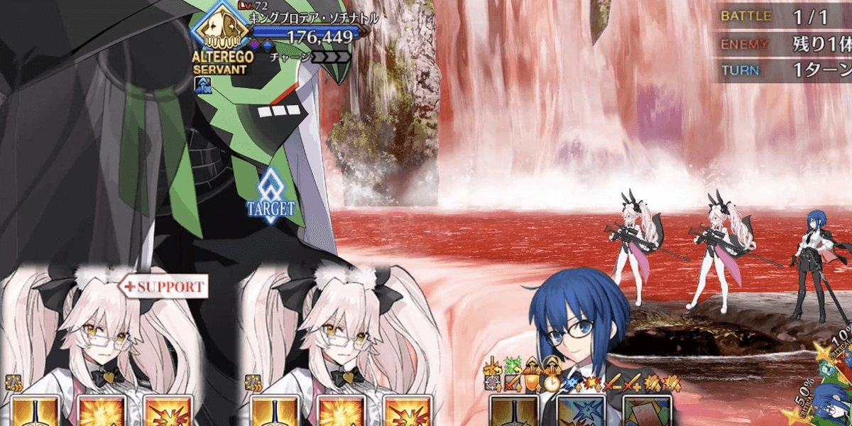 | ギミック | ・敵は特殊耐性(宝具&クリ)持ち ┗ブレイク毎にクリ→宝具が解除 ・最終ゲージでは毎ターンチャージ+1 ・スキルでコマンドカードに「カード燃焼」付与 ┣付与カードで攻撃するとHP減少(500) ┣6つ以上貯まると「呪殺の符」付与 ┗呪殺の符状態で宝具を受けると即死 |