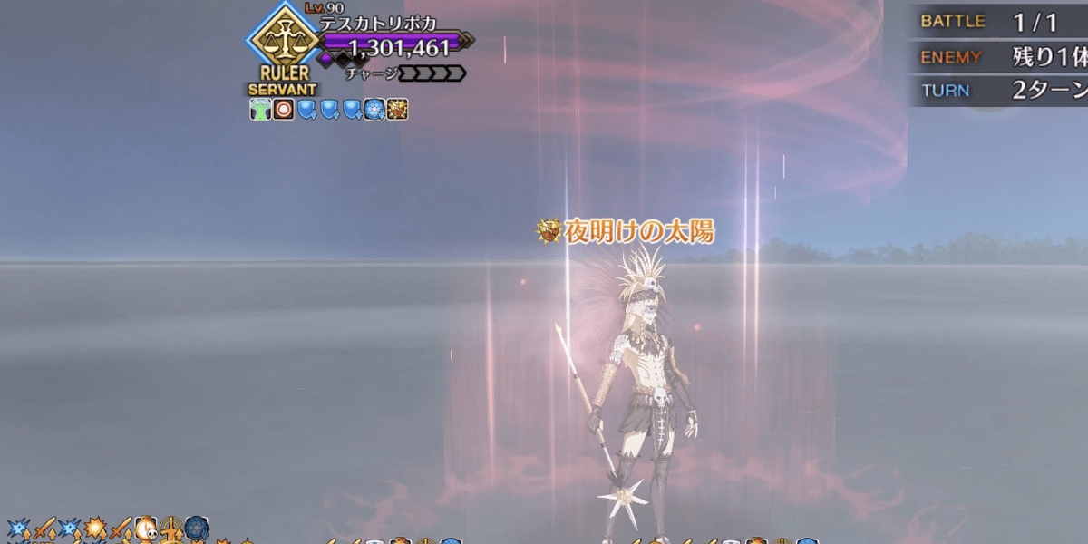 | 敵の最終ゲージHPが0になった時、ギミック発動 【第五の太陽】●ボスガッツで全回復&チャージMAX「第五の太陽」使用ターンは行動しないスリップダメージでHP0にした場合は1T遅延 ●控え含むマスター側全体スタン(1T)&NP最大300%チャージ通常攻撃封印(永続/解除不可) ┗宝具以外で攻撃できなくなるスタンは味方フェイズ開始時に回復する ┗付与された後にオダチェンした場合はスタン付き●「第五の太陽」の次ターン敵フェイズ時控え含むマスター側に解除不可永続スタン&強化解除 ※実質敗北 ▶テスカトリポカ戦リコレクションクエ攻略 |