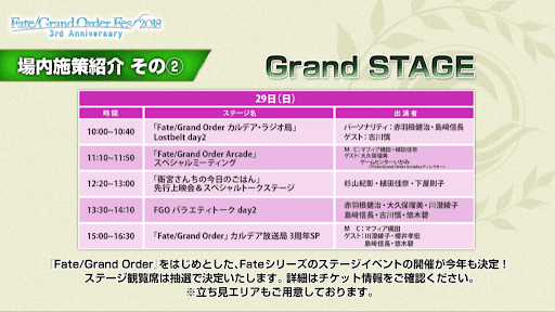 2日間におけるイベント内メインステージでの催し物もスケジュールとともに発表された。催しの最後には3周年を記念した「カルデア放送局」もあるため、ゲーム内でのキャンペーンなどがここで発表される可能性が高い。