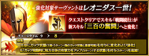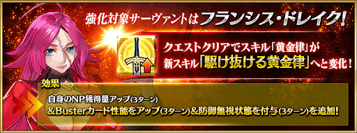 | 【開放】霊基再臨4回 / 強化クエスト1クリア【強化内容】スキル強化 ・カリスマ[A]→彼方に向かう者たち[A] ・味方全体に防御無視付与追加(3T) ・自身のNPを増やす追加(20~30%)【報酬・固定ドロップ】 |