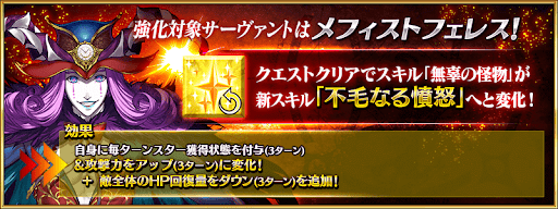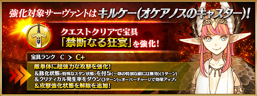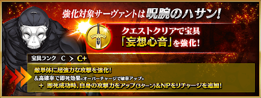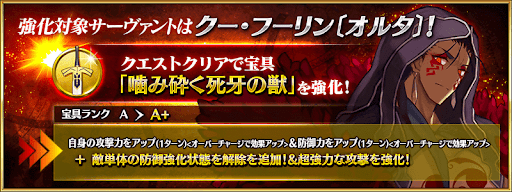 | 【開放】霊基再臨4回【強化内容】宝具強化 ・宝具[B]→[B+] ・攻撃と即死の順番が変更 ・敵全体攻撃の倍率強化(450~750%→600~900%) ・敵全体スキル封印追加(1T) ・即死の付与確率上昇(30~70%→60%~100%) ・フィールドを水辺にする状態追加(5T)【報酬・固定ドロップ】 |