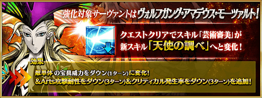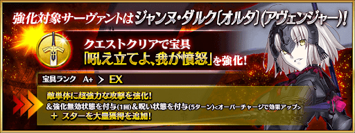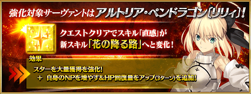 | 【開放】霊基再臨4回 / 強化クエスト1クリア【強化内容】スキル強化 ・軍略[C]→聖乙女の凱旋[EX] ・〔秩序〕特性の味方全体のクリティカル威力をアップ(3T/30~50%)追加 ・〔善〕特性の味方全体の宝具使用時のチャージ段階を2段階引き上げる状態を付与(1回/3T)追加 ・フィールドに〔星の力を持つ味方〕がいる時、スターを獲得(20個獲得)追加 ・自身に毎ターンスター獲得状態を付与(3T/5~15個)追加【報酬・固定ドロップ】 |