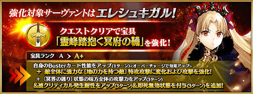 エレシュキガルは宝具強化により、威力の強化と地属性特攻を得た。元々NP50%チャージスキル持ちでコヤンスカヤシステムと相性が良く、特攻対象なら安定した威力で周回できるようになった。