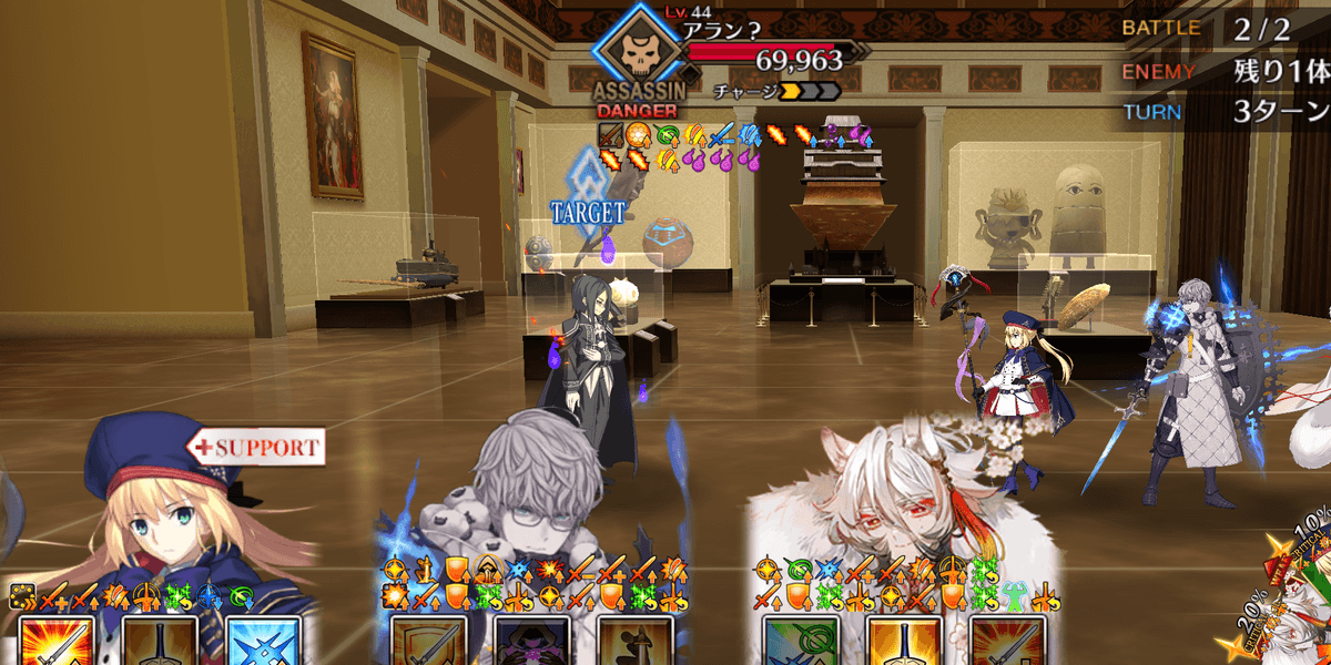 | 敵ギミック | ・開幕全体にダメージプラス付与(500/3T) ・2wave開始時、アラン?のクリティカル耐性アップ(30%/3T) ・クリック性能アップ(20%/3T) ・クリ発生率アップ(2T) ・毎ターン開始時にマスター側のスター減少(20個) ・アラン?は呪憑霊がいる間、攻撃力アップ(20%)&精神異常耐性ダウン・アランのブレイク時、マスター側全体のクイック性能ダウン(30%/3T) ・スター発生率ダウン(3T) |