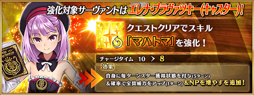 | 関連サーヴァントにボーナス追加 ┣強化大成功&極大成功率が2倍 ┣フレンドポイント獲得量2倍 ┗強化クエスト&幕間の物語の消費APが1/2 |