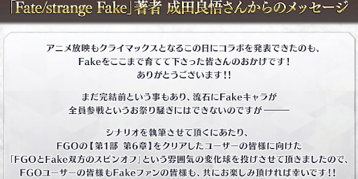 イベントシナリオを担当する成田良悟さんのコメントによると、Fakeコラボは1部6章をクリアしたマスター向けの物語になる。1部6章を前提としているため、参加条件は1部6章クリアになる可能性が高い。未クリアのマスターはイベント開始までにストーリーを進めておこう。