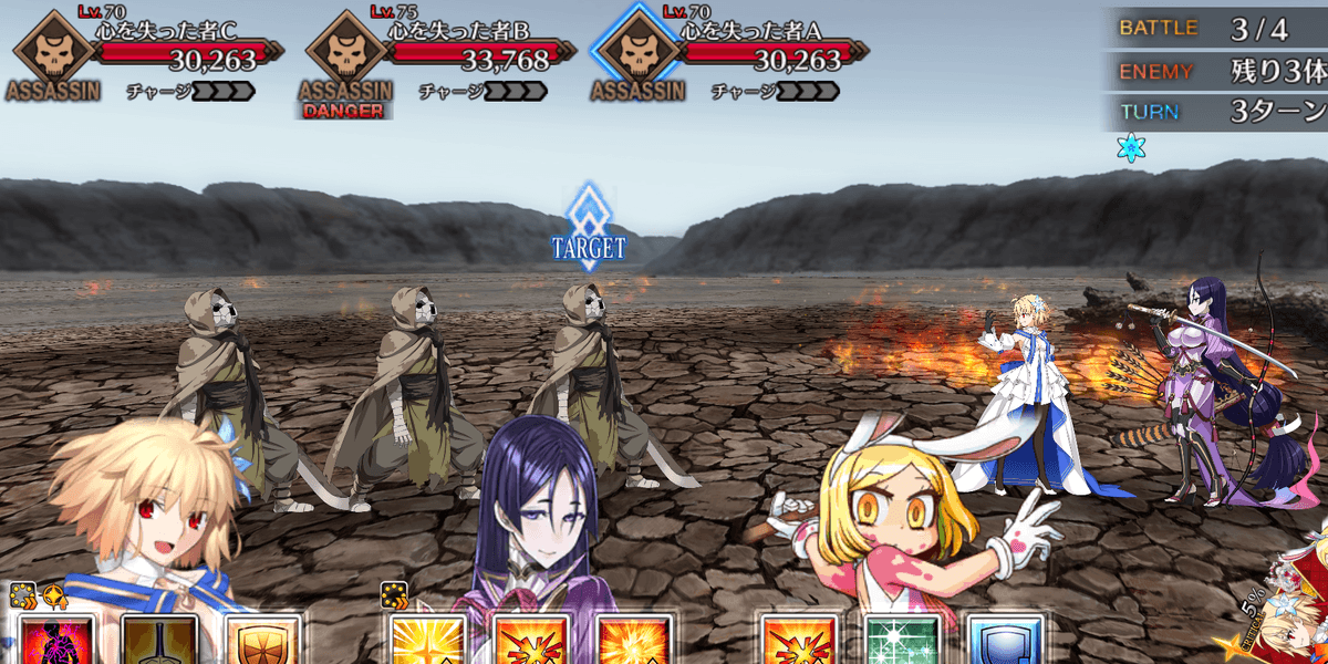 3ターン耐久でクリアできるため、宝具などを使用せず、自由にカードを選んで3ターン経過しよう。敵を倒すとこちらがダメージを受けるため、宝具は使用すべきではない。