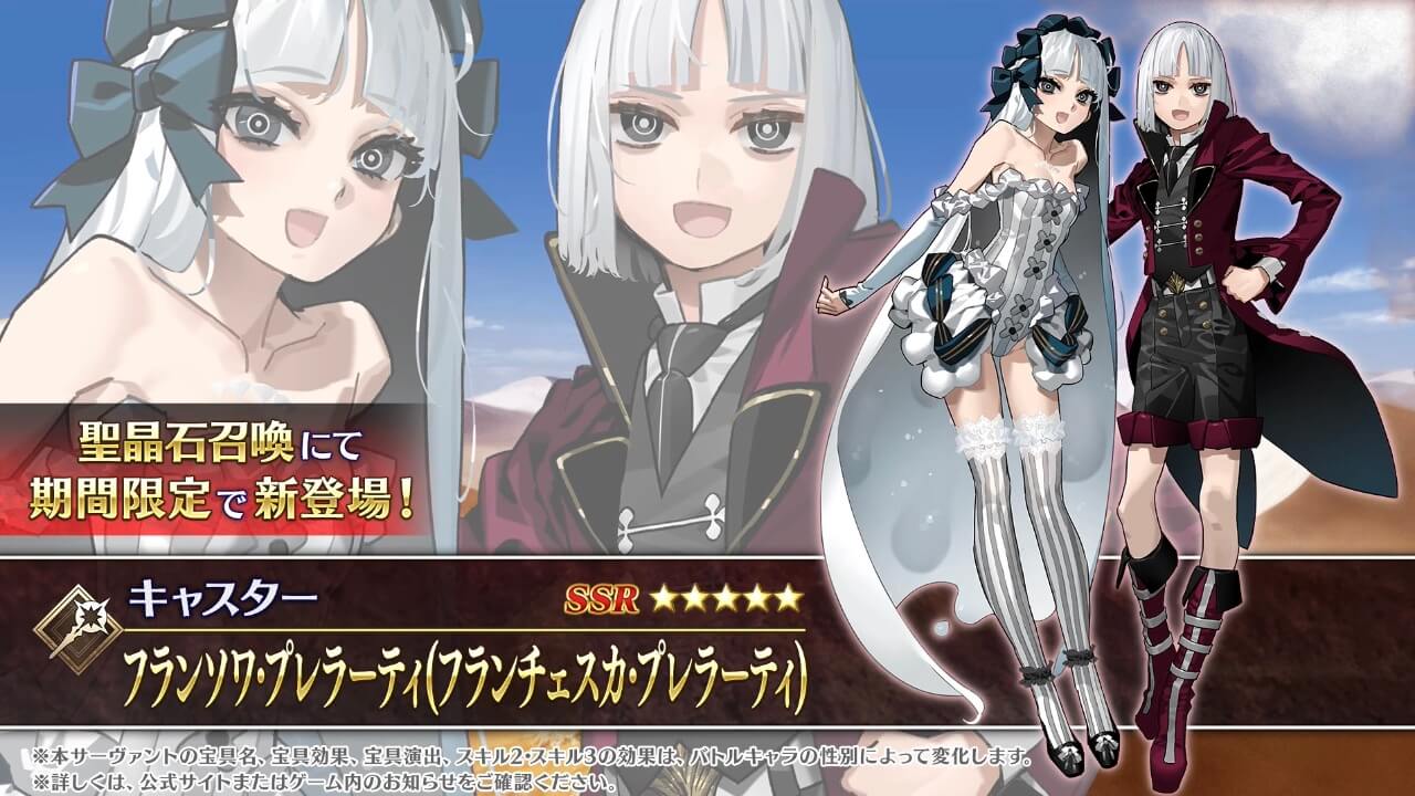 現在判明している新キャラは、星5プレラーティ、星4配布ヒッポリュテの2騎だ。プレラーティは、男女を切り替えると宝具やスキルの性能が変化する。出撃時点でも指定可能で、バトル中もスキルの使用で切り替えができるようだ。
