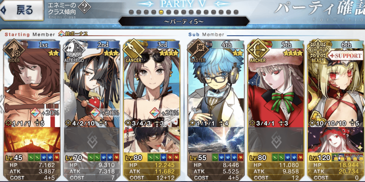 アルクは宝具Lv5かつLv120を条件としているが、魔術礼装の火力バフ未使用であるため、与ダメージはまだ伸ばせる。また、1ターン目にバスターが2枚以上配布されれば、空想樹のブレイクに余裕ができるため、完全体でなくとも余裕がある。