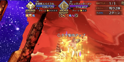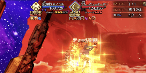 アシュヴァッターマンと空想樹のチャージ攻撃は、別々に受けよう。行動はアシュヴァッターマンが先なので、宝具後の防御強化解除により、空想樹のチャージ攻撃を無防備に受けてしまう。