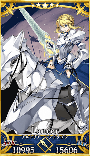 | 特性 | 天属性、秩序、善、女性、人型、騎乗、円卓の騎士、竜、王、アーサー、アルトリア顔、ヒト科 |