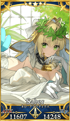 | 特性 | 人属性、混沌、花嫁、女性、人型、騎乗、ローマ、王、アルトリア顔、ヒト科、セイバークラスのサーヴァント | |