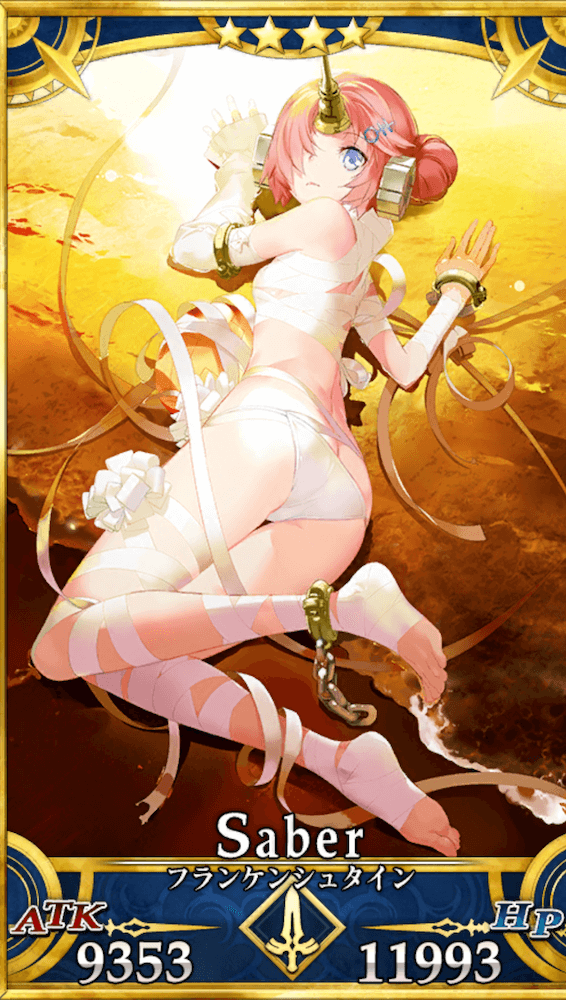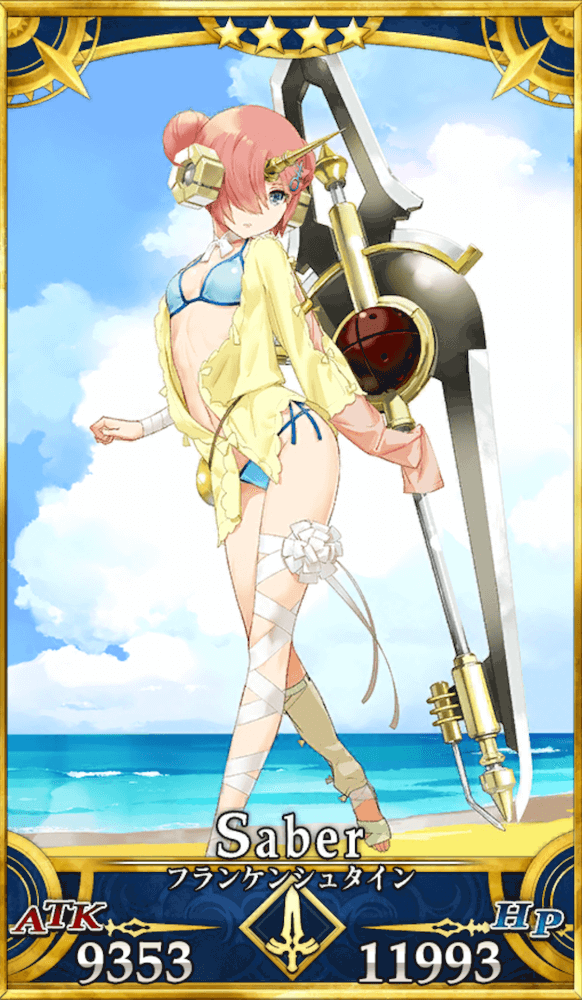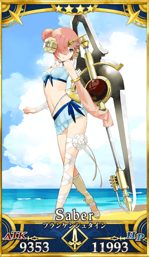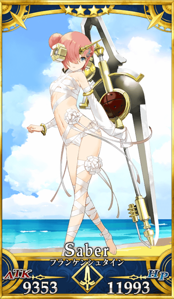 | 特性 | 地属性、中立、夏、女性、人型、騎乗、機械、ヒト科、夏モードのサーヴァント、セイバークラスのサーヴァント | |