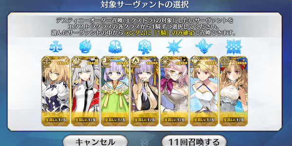 | 仕様 | ・星5サーヴァント×1枠確定の11連ガチャ ・7騎士版とエクストラ版で2回引ける ・確定排出の星5枠は自分で選択可能 ┣7騎士とエクストラで2種類 ┗設定した7クラスの中から1枠確定 ・設定可能星5は恒常/スト限/限定問わず |