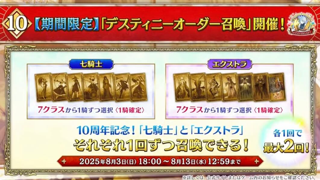 10周年のデスティニーオーダー召喚は、最大2回引ける。7騎士のデスティニーオーダー召喚と、エクストラクラス限定で設定できるデスティニーオーダー召喚の2種類をそれぞれ1回ずつ引ける。