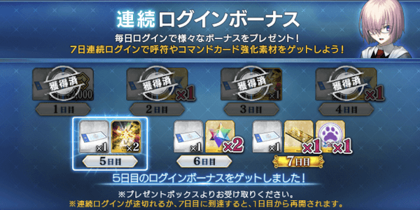 1週間毎日ログインすると、4個の聖晶石を入手できる。呼符1枚も入手可能なため、1週間のログインで2回召喚分のアイテムが入手可能だ。一度でもログインが切れると週間ログインボーナスは1日目に戻るため、毎日必ずログインしよう。