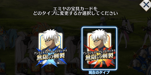 宝具色を変更しても自己バフだけならダメージはほぼ同じであるため、NP回収目的でアーツ宝具に切り替えるのがおすすめ。ただし、サポーターによりカードバフを付与する場合は、付与するバフと一致させた宝具色のほうがダメージを伸ばせる。