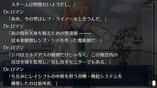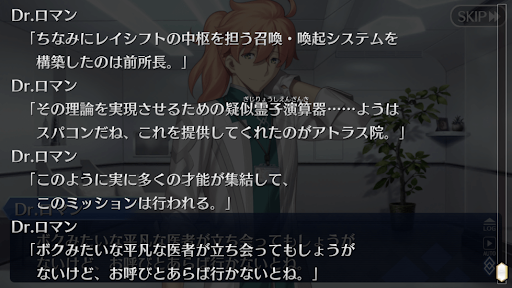 次に技術者のレフ・ライノールを含め、オルガマリー所長の説明会に出席するも、主人公は寝坊してしまい、会場追い出されてしまう。そして、マイルームに戻り、医療班のリーダー、ロマニ・アーキマンと出会う。