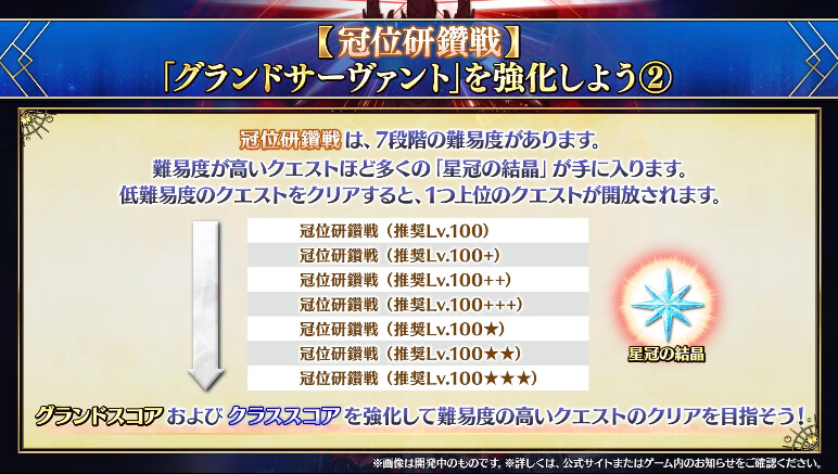 冠位研鑽戦を周回し、グランドスコア強化に必要な「星冠の結晶」を集めよう。冠位研鑽戦は7種類の難易度があり、高難易度ほど星冠の結晶の入手効率が上がるため、できるだけ高難易度の冠位研鑽戦を周回すると良い。