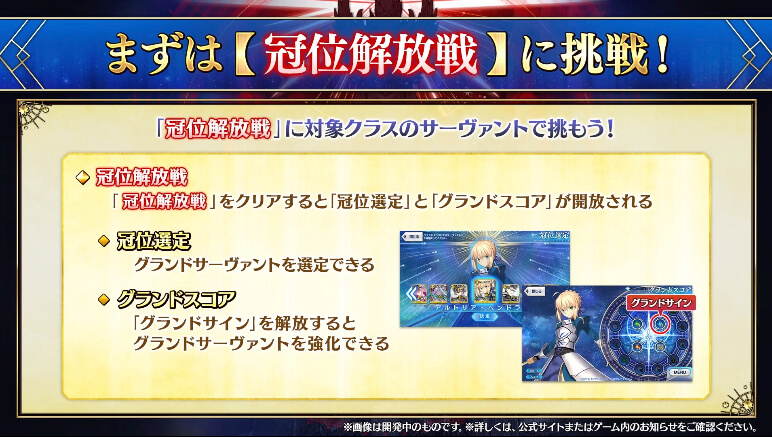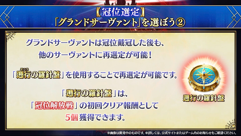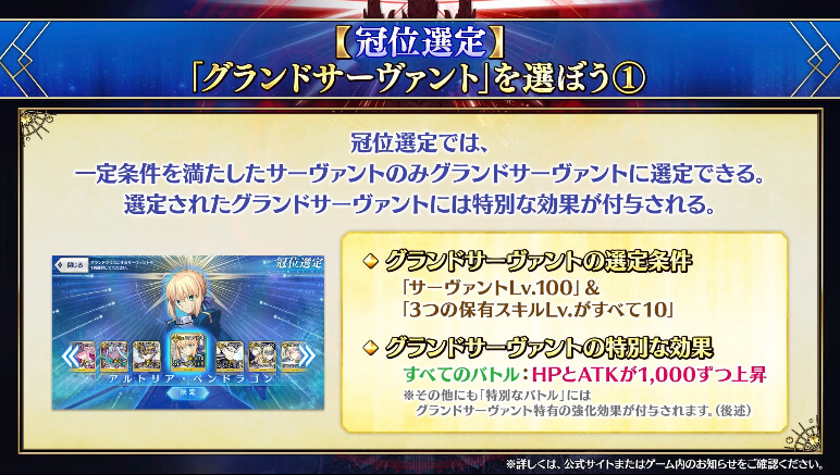 各クラスの冠位戴冠戦が開放されたら、まず冠位解放戦をクリアしよう。冠位解放戦をクリアすると、当該クラスの冠位選定、つまりグランドサーヴァントの指定ができるようになる。