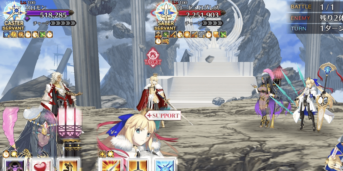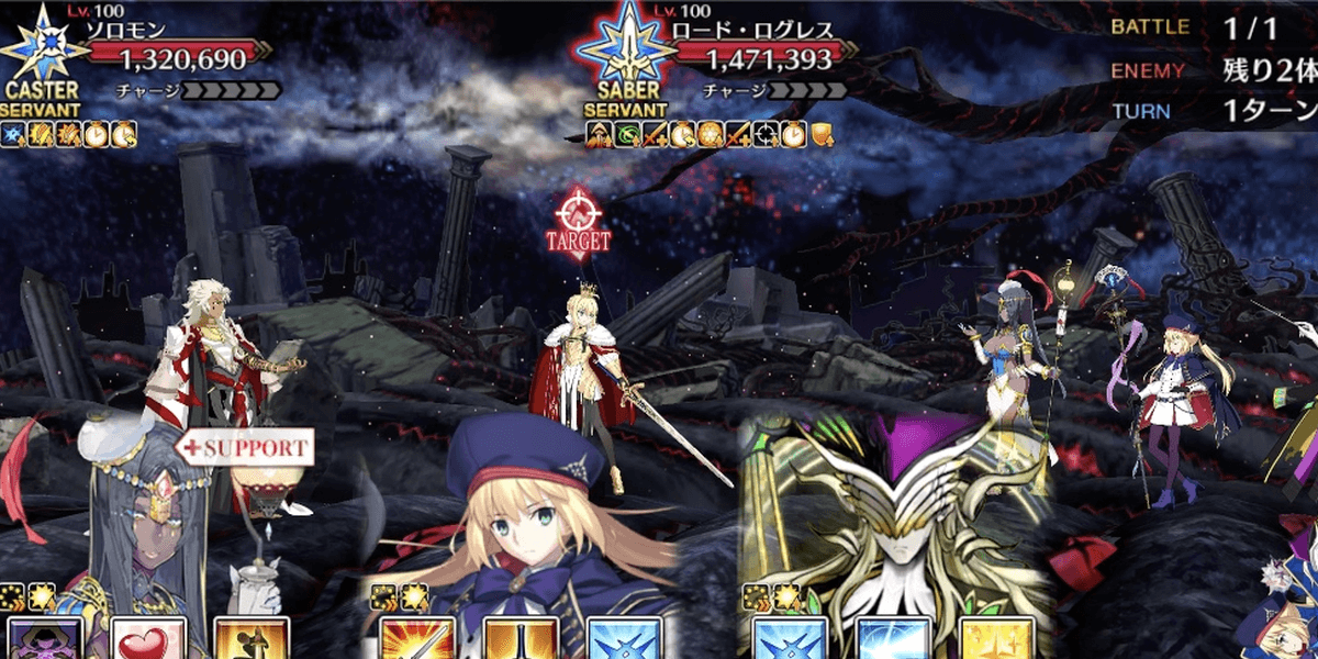 ソロモンとロード・ログレスは王特性持ちなため、シェヘラザートの宝具が最もダメージを与えやすい。また、ロード・ログレスを倒した後は単体宝具で一気にソロモンを倒すのもおすすめだ。
