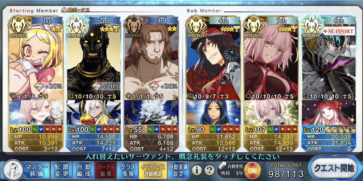 | 手順 | ・エイリーク>バニヤンの優先度でBが1枚以上あるキャラと金時を入れ替える ┗入れ替える前にデバフスキルは使用 ・バニヤン、ダレイオスの横バフは金時登場後 ・B+ダレイオス+金時の順で宝具を使用 |