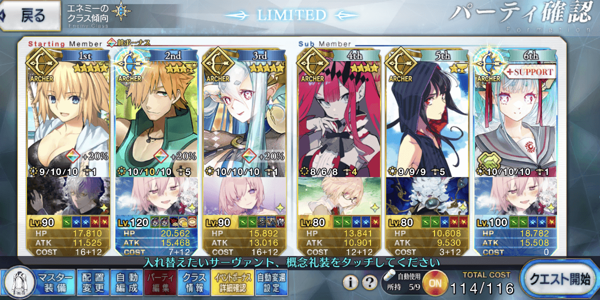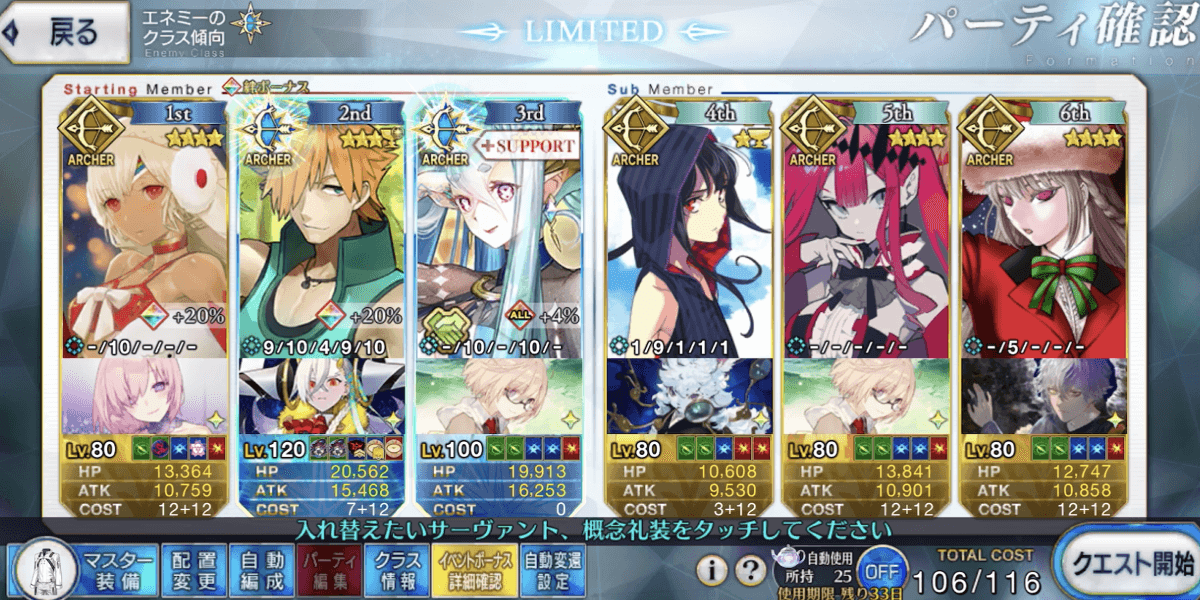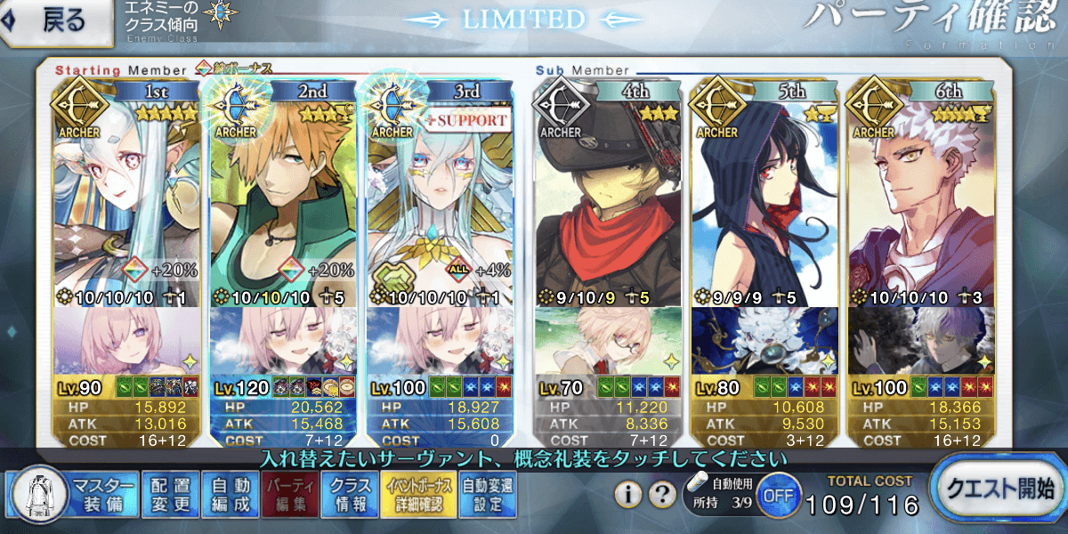 | ▼アーチャー | ★★★★★・自前でアタッカーを用意 ┗増加礼装2枚積み可能 ・サポの宝具Lvに依存しない ・カード運あり(対策あり) |