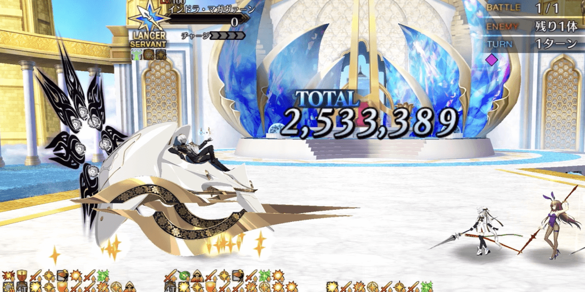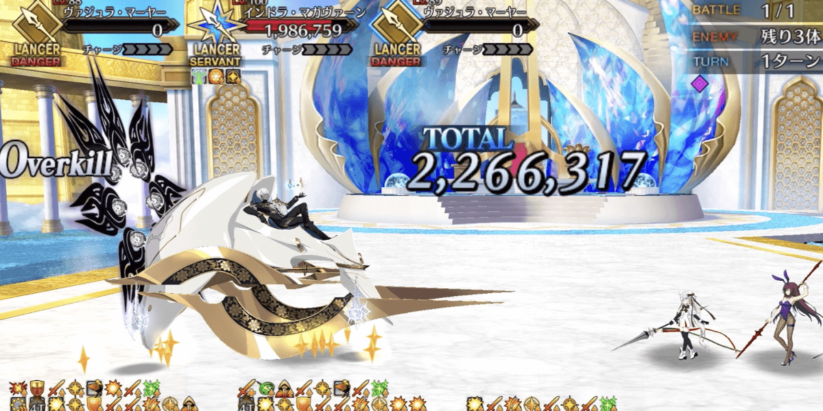 ランサーの研鑽戦は、メインアタッカーはサポートから借りて、自前サーヴァントで火力補助をすると良いです。自前の中では、ジャンヌリリィをグランド化して育成すればヴァジュラ処理も可能で、宝具効果で火力支援もできます。ヴァジュラは1体倒すごとに、インドラの特殊耐性アップ状態を30%分打ち消せます。