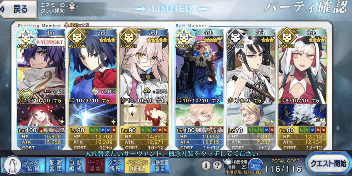 | ▼アサシン | ★★★☆☆・自前でアタッカーを用意 ・サポの宝具Lvに依存しない ・装備できる増加礼装少なめ |