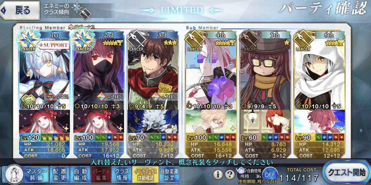 | 手順 | ・ヘクトールと控えでバフを盛る ・ジャンヌリリィ→スカサハの順で宝具使用 ・可能ならマイティチェインを組む |