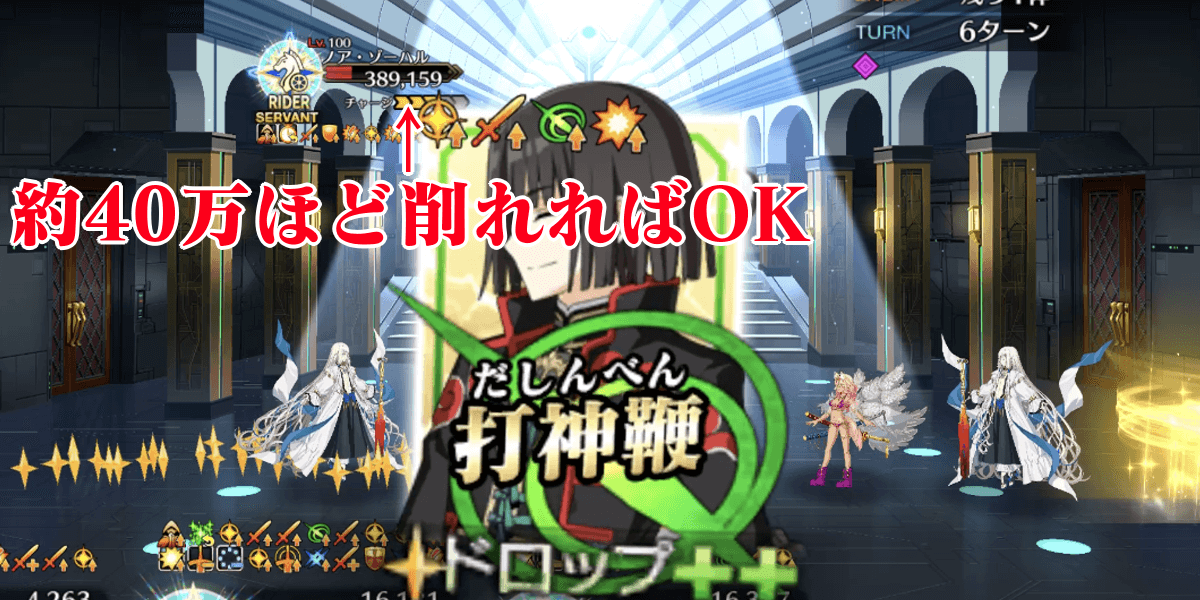 ウマのガッツ効果が切れる5ターン経過までは、ウマの体力を削りつつ耐久しよう。左端のウマは単体宝具に弱いが全体宝具に耐性を持ち、中央のウマは全体宝具に弱いが単体宝具に耐性を持つ。HPを均等に削れるように、追撃対象を調整してバランス良く削っていこう。