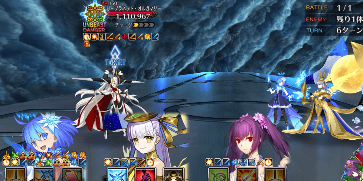 | 宝具 | ・1ゲージ目はEXアタック・2ゲージ目以降 【すでに過ぎし人理の終】 ・敵全体のクイック耐性をダウン(1T/20%) ・アーツ耐性をダウン(1T/20%) ・バスター耐性をダウン(1T/20%) ・強力な攻撃 ・〔人・星の力を持つ敵〕特攻 ・攻撃力をアップ(3T)<10%~30%> ・チャージ1増加 |