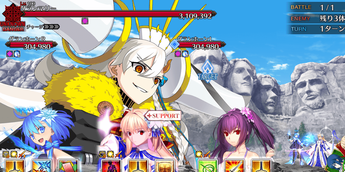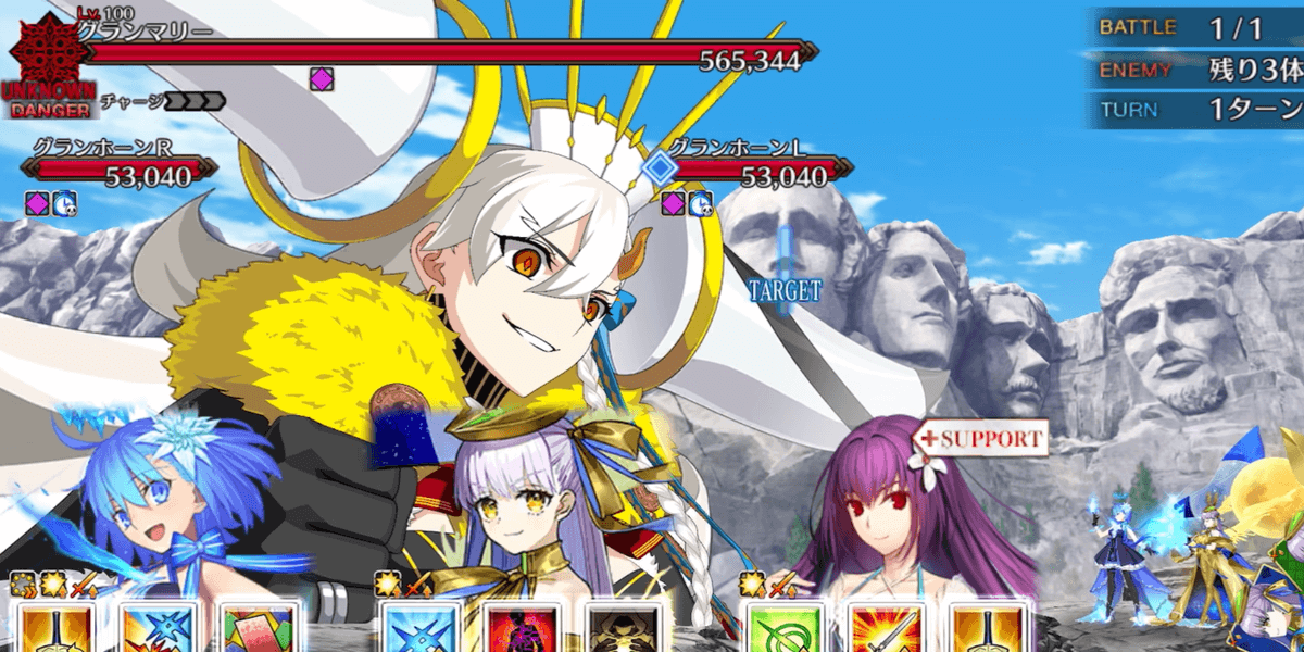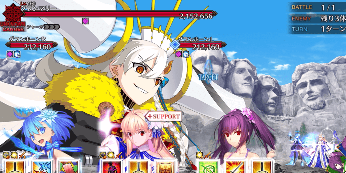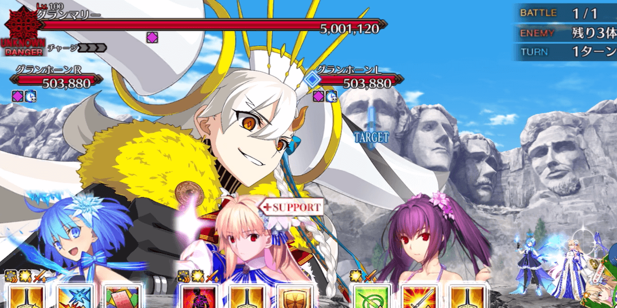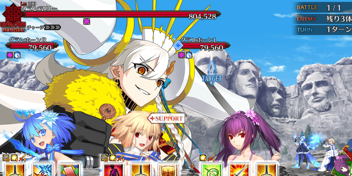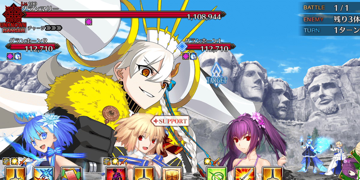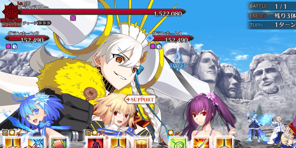 冠位研鑽戦[地]では、取り巻きのグランホーンを倒すと、グランマリーの耐性がダウンする。100★★★でのグランマリーのHPは500万以上なため、グランホーンを撃破してからでないと、攻略が困難になるため、全体宝具で取り巻きを倒してから、単体宝具でボスを倒そう。