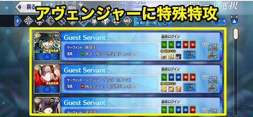 | アタッカーは讐か臨クラスアヴェンジャーは特殊特攻持ち ※NPCアヴェンジャーは追加バフありフォーリナーはクラス有利 |