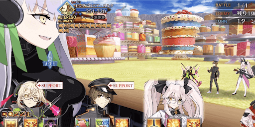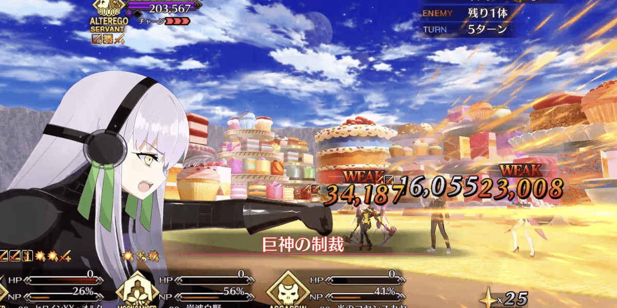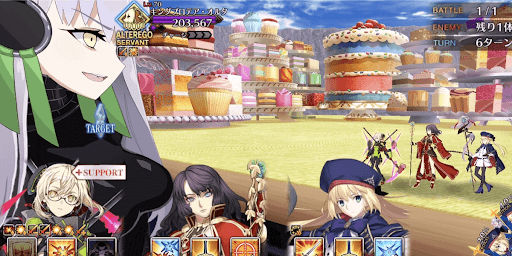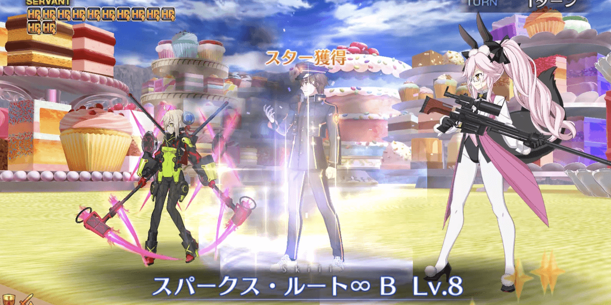 | 開始時 | 【漆黒たる世界に平和を!】 ・自身のバスター性能アップ(永続) ・超巨大特攻付与(永続) ・ガッツ1回付与(HP100%/1回) ・「ケーキ・イーター」状態を付与 |