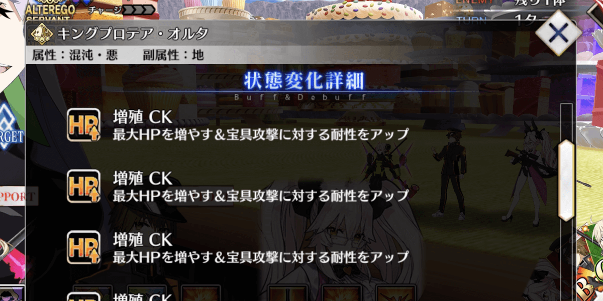 | 開始時 | 【増殖CK】 ・自身に「増殖CK」を12個付与 ・1個あたり最大HP1万増加(最大12万) ・1個あたり宝具攻撃耐性5%(最大60%) |