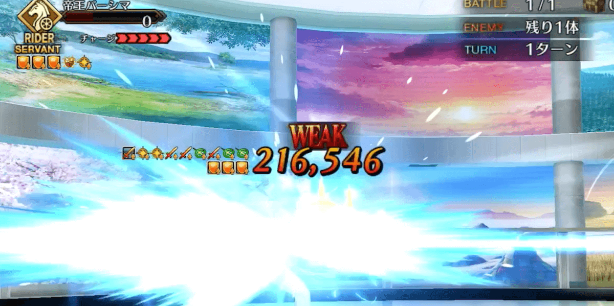 式と草十郎の宝具チェインでそれぞれ20万ほどHPを削り、パーシマのガッツ発動を狙う。両儀式の礼装は「ウィナーズアイLv100」が理想だが、「オーシャンフライヤーLv100」でも代用可能。ただし、乱数で取りこぼすため、草十郎の礼装レベルを上げるなどで調整しよう。
