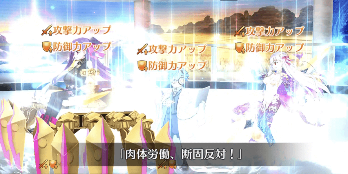 【うおおお! 勝負はこれからだああ!】 ・自身のチャージMAX ・弱体解除&全属性耐性付与(100%/1T) ・宝具封印無効(1T)付与 |