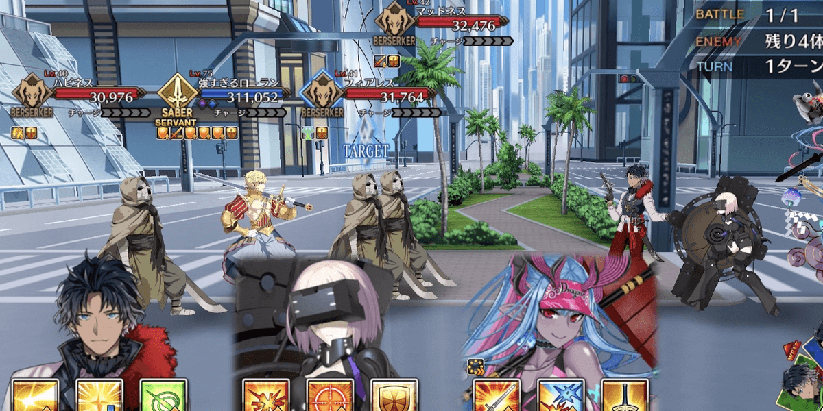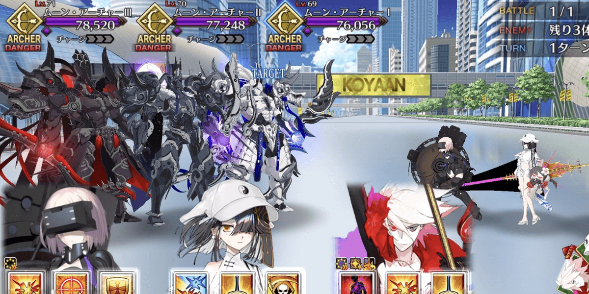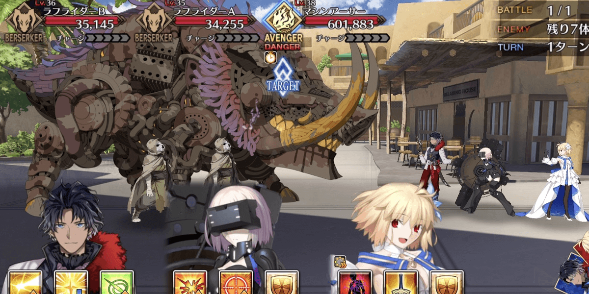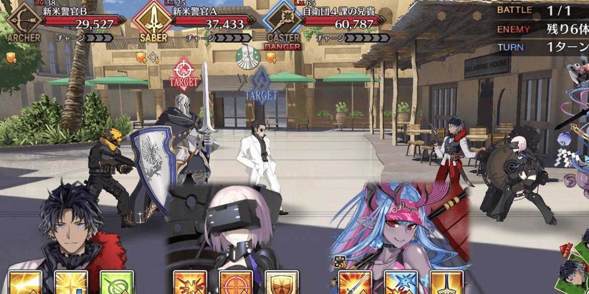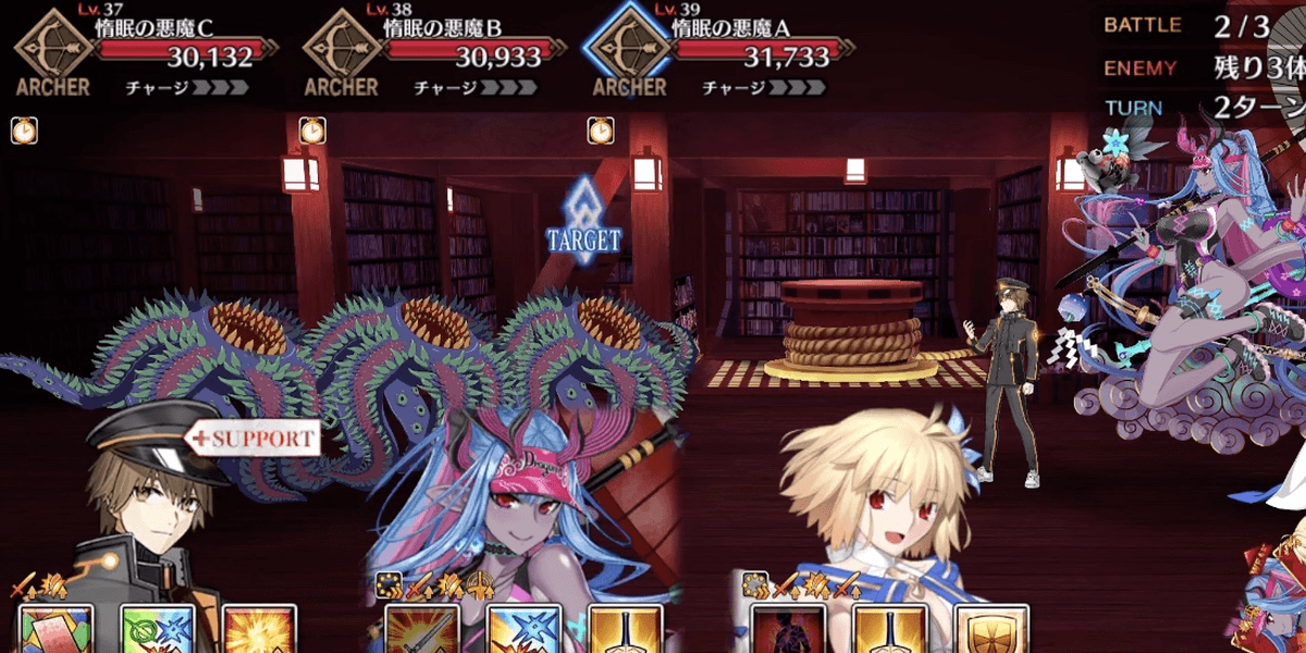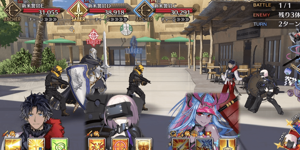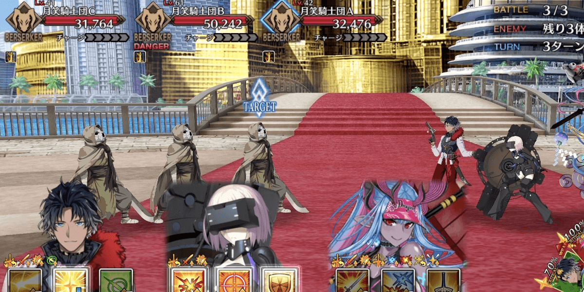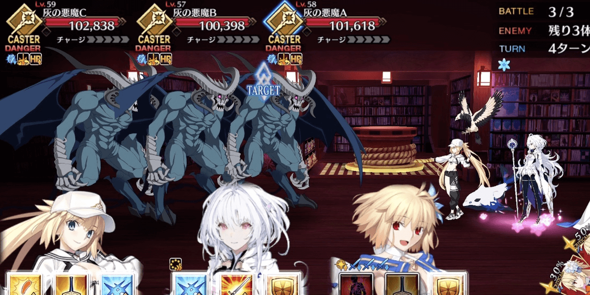 | 各エネミーのギミック ●セイバー自身の攻撃力&バスターアップ(3回)通常攻撃で対象にやけど付与●ライダー自身のクリ威力&宝具威力アップ(永続)マスター側全体の防御力ダウン(5T/解除可) &クリ威力&宝具威力ダウン(5T/解除可)●アーチャー通常攻撃で対象に毒付与自身に毒特攻状態を付与●アサシン自身のクリ率アップ(1回&永続) &クリ威力アップ(1回&永続)●キャスター自身に防御無視付与(永続) &通常攻撃で確率スタンを付与●バーサーカー自身に必中&攻撃力アップ付与(永続)&チャージMAX(単体宝具)●ランサー自身の攻撃時、対象に呪い&防御力ダウン付与 |