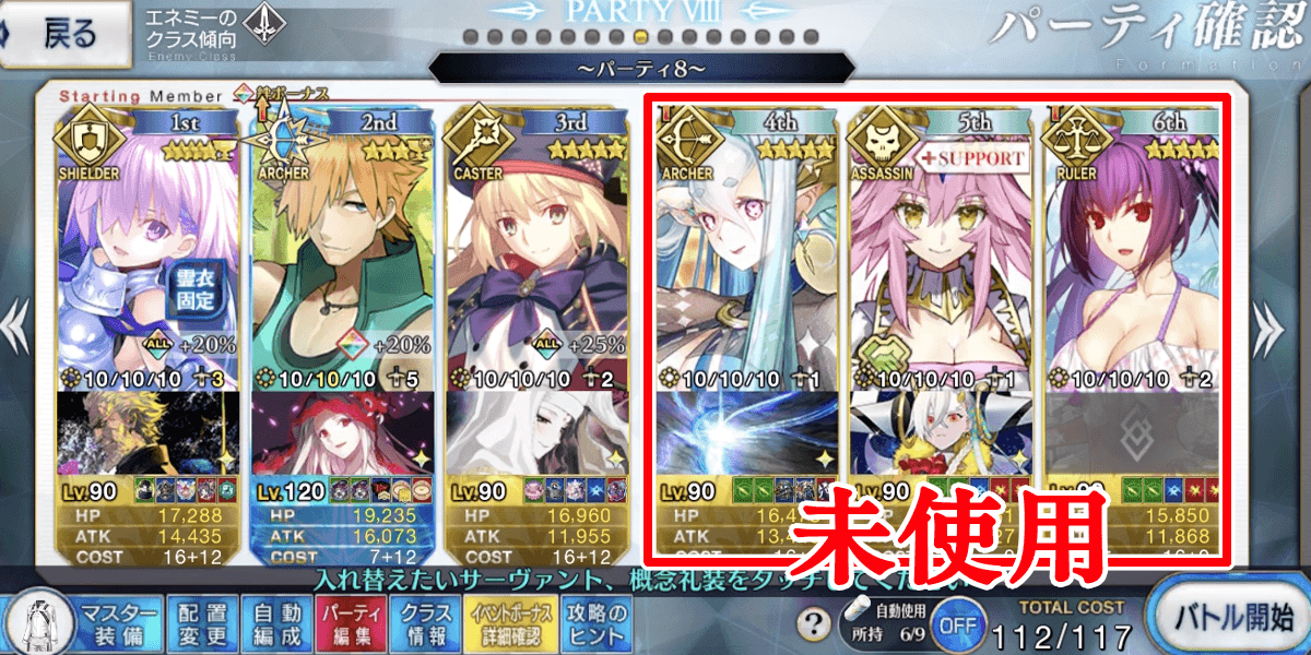 | スキルは1ターンに3回以上使わないNP供給2回→火力支援2回などバフが維持する順番を意識する |