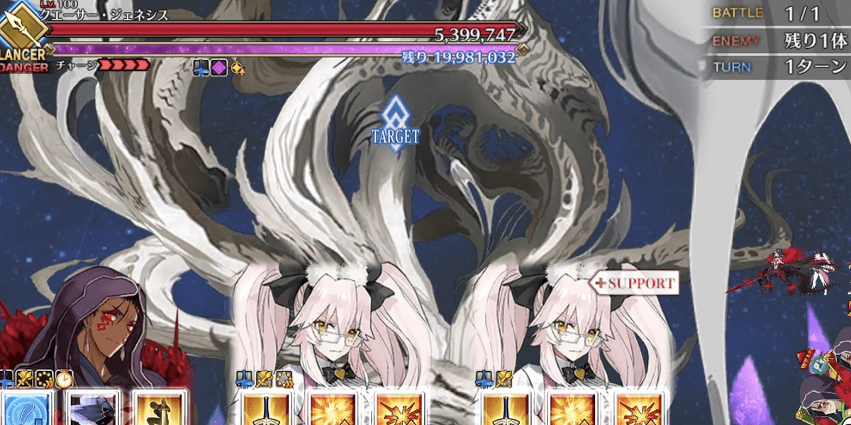 敵が人属性であるため、Wコヤンで特攻バフを付与しつつ、カードバフでも火力を伸ばせるバスター単体宝具で1ターン周回する編成。敵がランサーであるため、バーサーカーかセイバー、ギミックにより攻撃有利のムーンキャンサーからバスター型を採用すると良い。