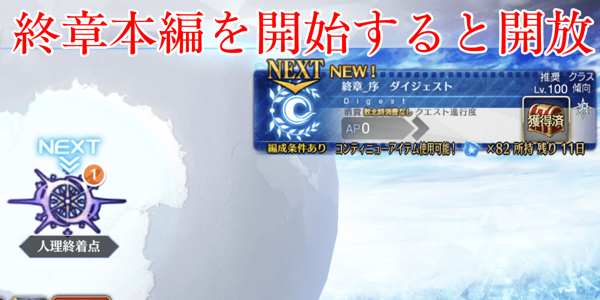 終章_序は、「終章_序」と「終章_序ダイジェスト」の2種類が開放されるが、「終章_序ダイジェスト」をクリアすれば良い。ダイジェスト版の方がクリア難易度が低く、2部終章本編の攻略にスムーズに移れる。