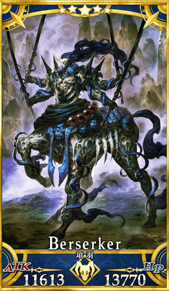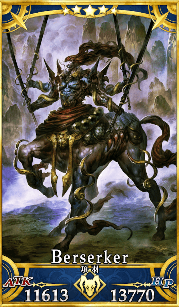 秦以降の中国で一騎当千の武将として名を馳せた英雄。現状バーサーカーとしてのみ実装されている。ライダーやランサーとして現界する可能性もあり、その際はバーサーカーよりも強力な性能を持つとされている。
