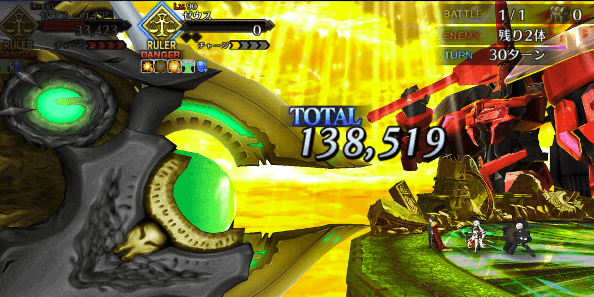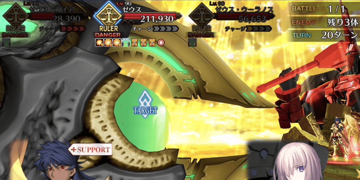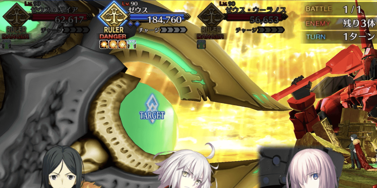 ゼウス本体は強化解除や無敵貫通を使わないので、ウーラノスを最優先で処理すれば、耐久特化の編成で安定して突破できる。戦術としてはひたすらアーツチェインでNPを貯め、宝具効果の防御バフを切らさないように戦おう。