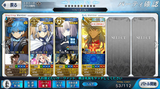 敵の火力が高く3騎全員を防御に回すため、クリアまで非常に時間がかかる。マシュの「ブラックバレル」付きバスターならダメージに期待できるが、バスターを使える機会が少ないため、安定を取るなら封印するべきだ。