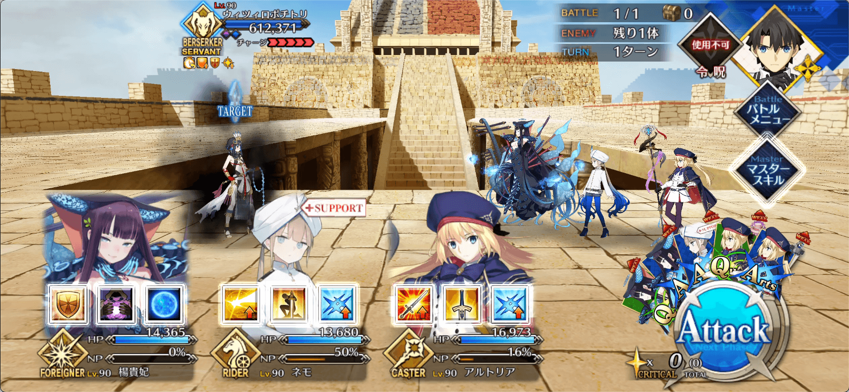 ウィツィロポチトリは、毎ターン無敵3回状態にもなる。礼装などでの無敵貫通効果が必須と言える。